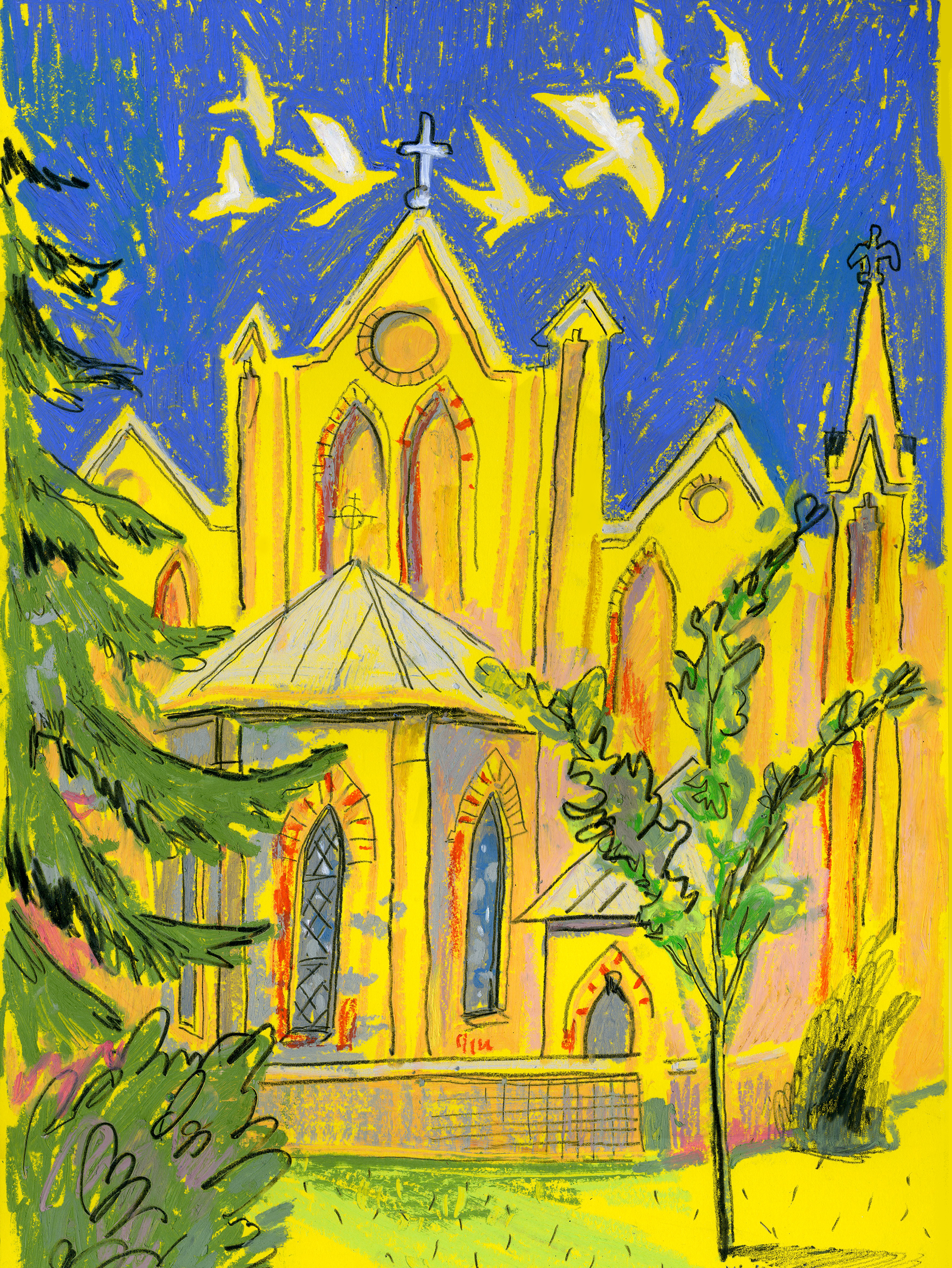 Pigeons over the church